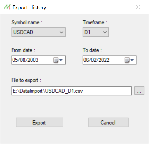 The Export button allows the user to export the data for the selected symbol and timeframe in Metastock text format.